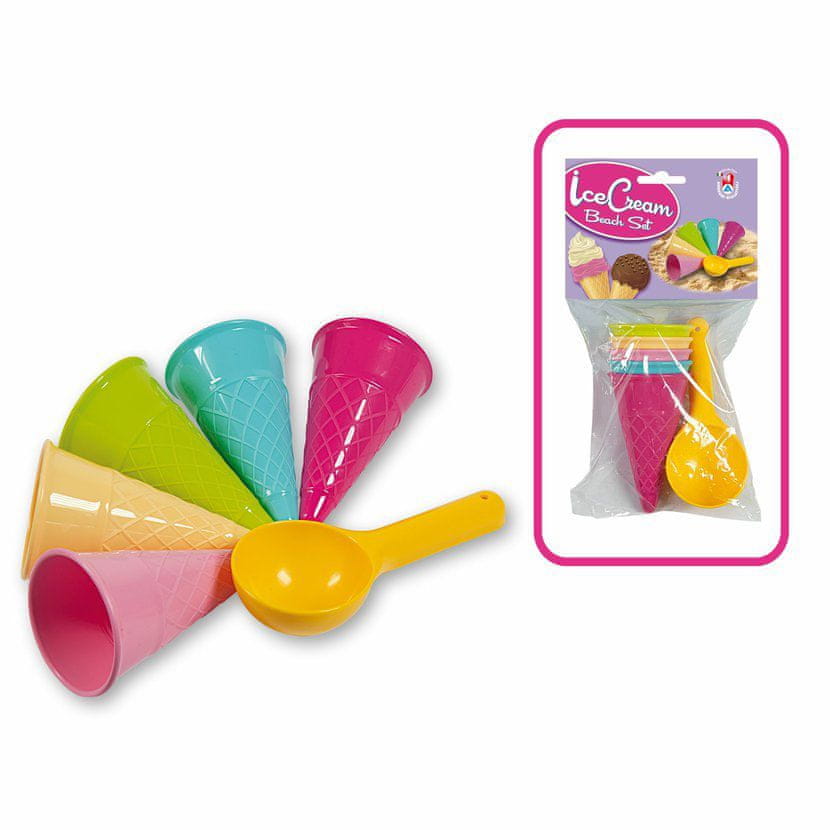 6-delni set peščenih modelčkov za sladoled. Izdelano v Italiji iz visokokakovostne plastike. Vključuje pet kornetov in zajemalko za sladoled. Pakiran je v vrečki velikosti 15 × 31 cm. Teža: 0,17 kg. Teža: 0,14 kg. Priporočena starost od 12 mesecev naprej.