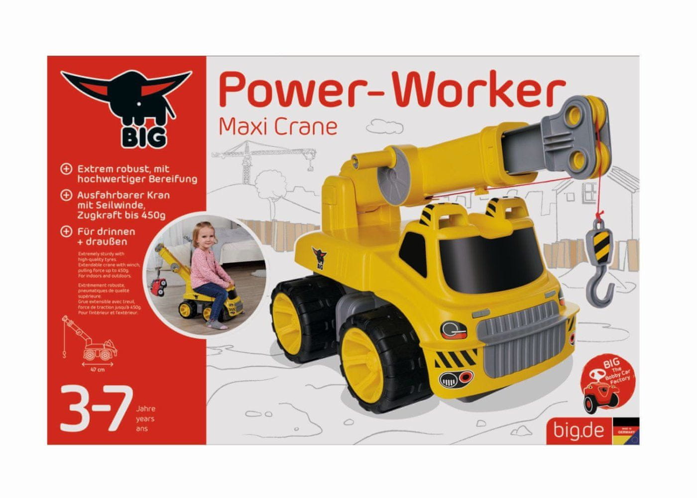 Velik žerjav iz visokokakovostne, robustne plastike, vrtljiv za 360 stopinj, z gibljivo roko. Glavna značilnost je izredno močan vrvni vitel, s katerim je mogoče brez težav vleči predmete z vlečno silo do 450 g. Vrvni vitel je del roke žerjava, ki je enostavna za uporabo in jo je mogoče zložiti in zavrteti za 360° okoli svoje osi. Sprednja in zadnja zaščita pred prevrnitvijo zagotavlja potrebno varnost. Z dvema ročajema na vozniški kabini je zagotovljen udoben način vožnje. Kovinske osi in visokokakovostne pnevmatike iz mehke plastike ne puščajo sledi in prav tako zagotavljajo najboljše vozne lastnosti. Žerjav BIG Power Worker Maxi je idealen za majhna gradbišča na igrišču, vrtu in v otroški sobi. Izdelan je v sodobni tovarni BIG v Nemčiji in je bil preizkušen za največjo varnost. Največja nosilnost 50 kg. Dimenzije: 51 × 30 × 33 cm. Teža 3,5 kg.