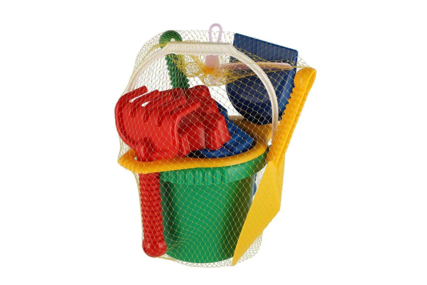 Plastični set za pesek. Set vsebuje vedro, sito, lopate, grablje in 2 posodi za pesek. V mreži 20×28×12 cm. Primeren od 12. meseca dalje.