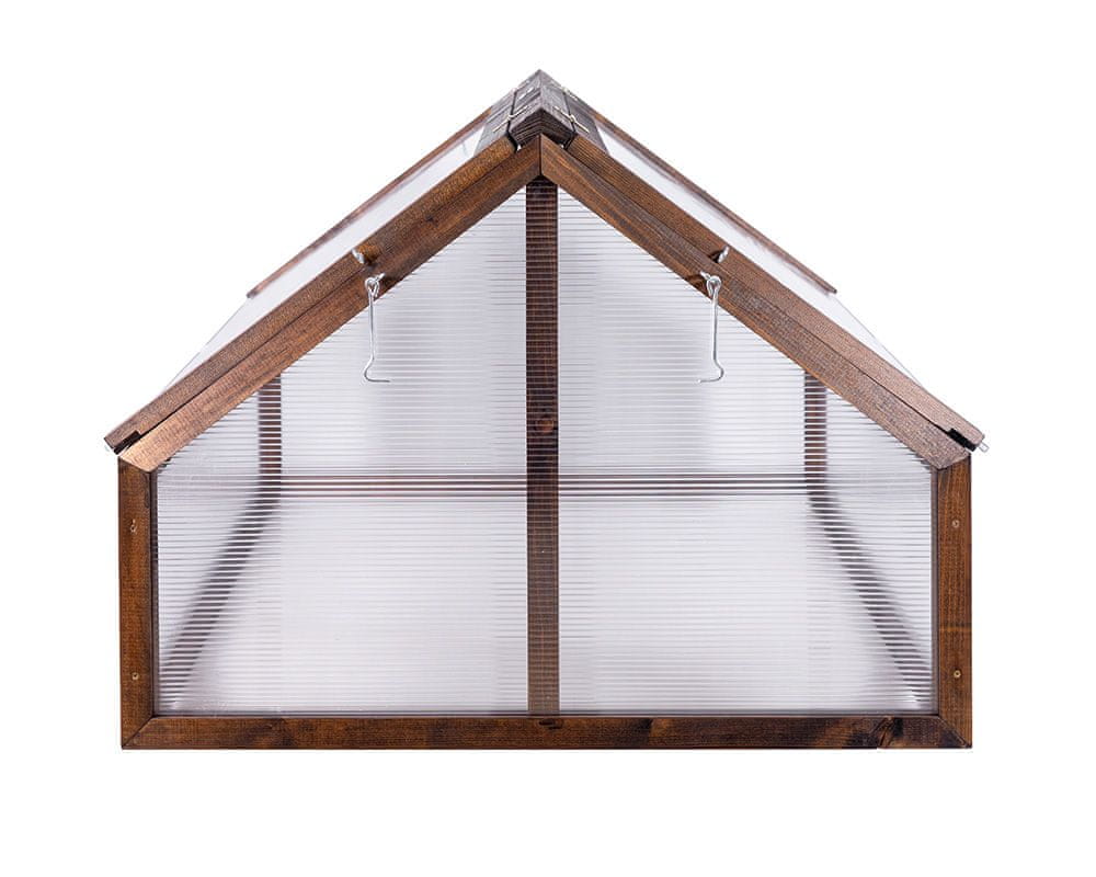 Izdelan iz izbranega smrekovega lesa, zaščitenega z impregnacijo s smolo, je les odporen na vlago, zmrzal in sonce – brez potrebe po barvanju do 3 leta. Ojačana celična polikarbonatna prevleka krepi strukturo, zahvaljujoč UV-sloju pa polikarbonat ostane brezbarven in preprečuje bel odtenek.