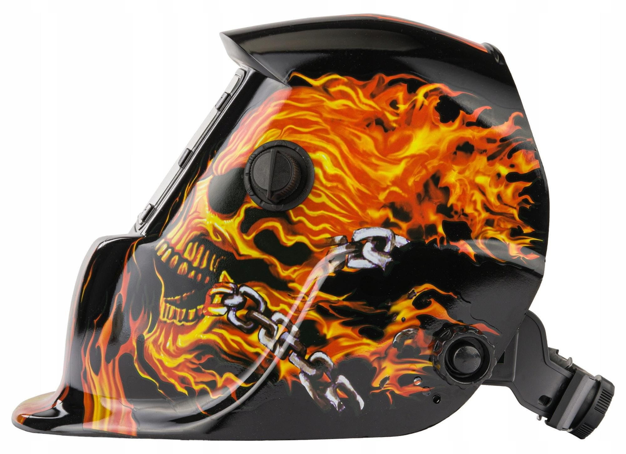 Zahvaljujoč vgrajenemu solarnemu panelu, ta maska samodejno prilagaja stopnjo zatemnitve glede na jakost svetlobe, kar omogoča varilcu nemoteno delo brez potrebe po ročnem prilagajanju. Motiv goreče lobanje na maski bo zagotovo pritegnil pozornost in dodal pridih individualnosti vašemu delovnemu okolju.