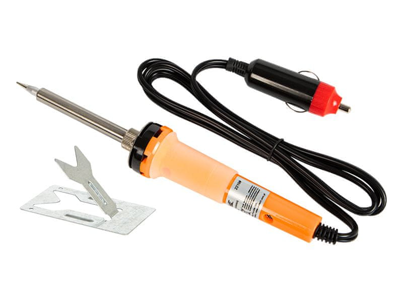 Spajkalnik za majhne elektronske komponente. Grelni element je zamenjan z debelo jekleno konico. Primeren je tako za ljubiteljsko kot tudi za profesionalno uporabo. Z gumo prevlečen ročaj zagotavlja varnost in udobje pri delu. Kabel je zaključen z vtičem za vžigalnik, zato je idealen za delo v avtomobilu, na čolnu itd., tj. povsod, kjer ni dostopa do 230-voltne napetosti.