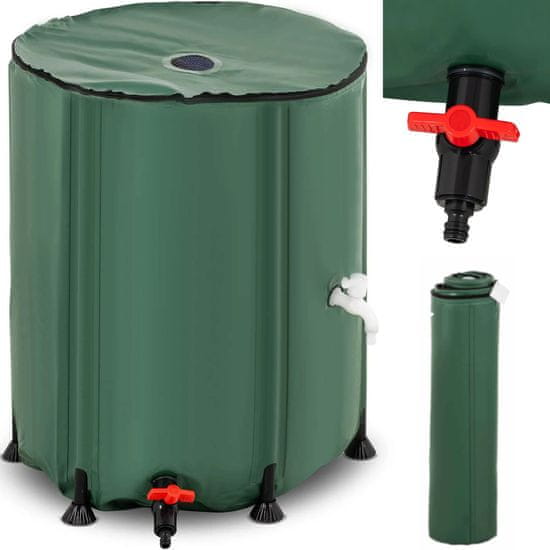 Rezervoar za deževnico Hillvert ima prostornino 200 litrov. Zaradi zložljive oblike je primeren za kampiranje na zemljišču. Posodo je enostavno razložiti, pokrov iz odpornega PVC-ja pa je napeta s plastičnimi palicami, ki zagotavljajo stabilnost rezervoarja. Pokrov ima odprtino za dovod deževnice v notranjost. Mrežni filter preprečuje, da bi umazanija in listje vstopili v vsebino. Pipa omogoča polnjenje posode za zalivanje z vodo, izpustna pipa na dnu ima 3/4'' priključek za priključitev vrtne cevi in praznjenje posode. Prelivna pipa varuje sod med močnim dežjem. Rezervoar je izdelan iz trpežnih materialov, primernih za uporabo na prostem. Pokrov iz PVC je izdelan iz tkanine 500D in je odporen na UV-žarke. Hkrati je tudi prilagodljivo in ga je mogoče zložiti na majhno velikost.