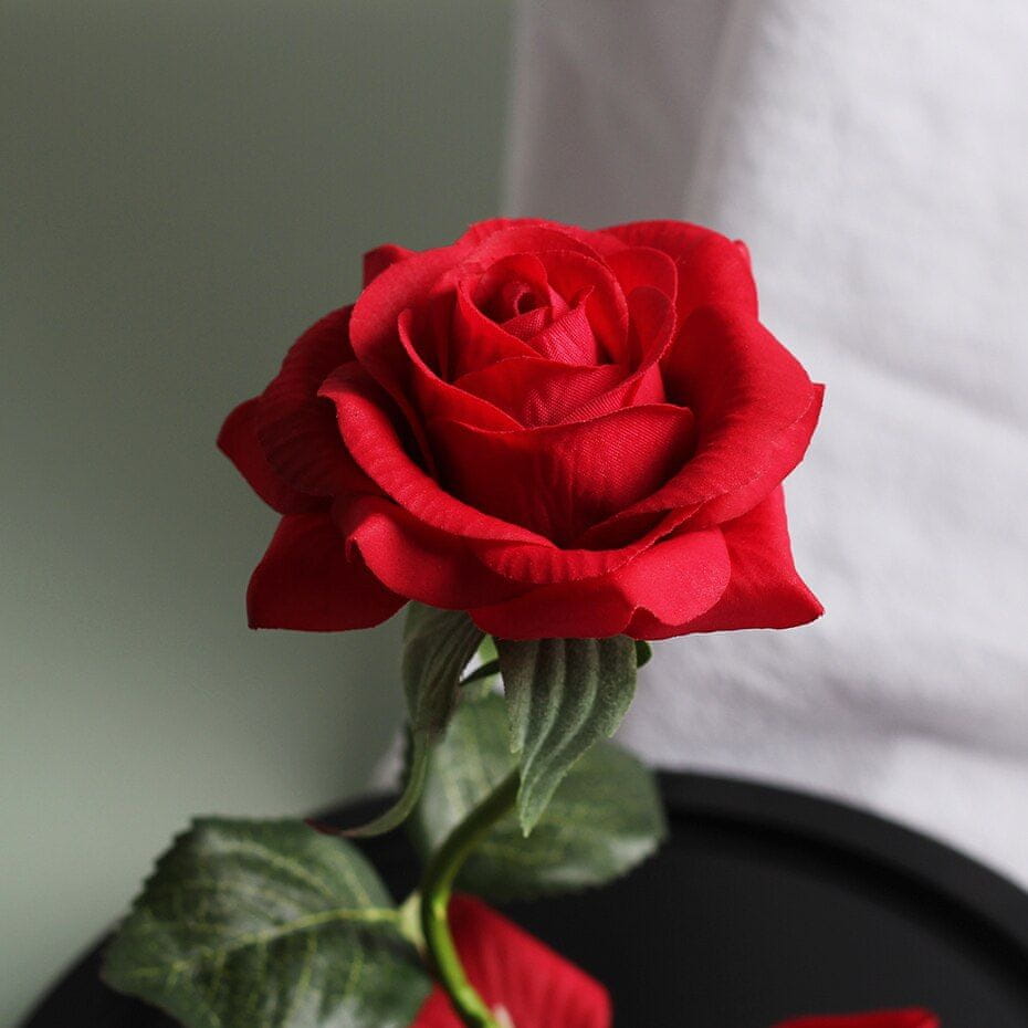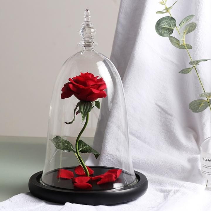 Rdeča vrtnica je elegantno postavljena pod steklenim stožčastim pokrovom na črni bazi. Zahvaljujoč posebni konzervaciji cvet izgleda svež in je mehak na dotik. Celoten pokrov je osvetljen s LED lučkami okrog osnove, kar dodatno poudarja njen sijaj in lepoto.