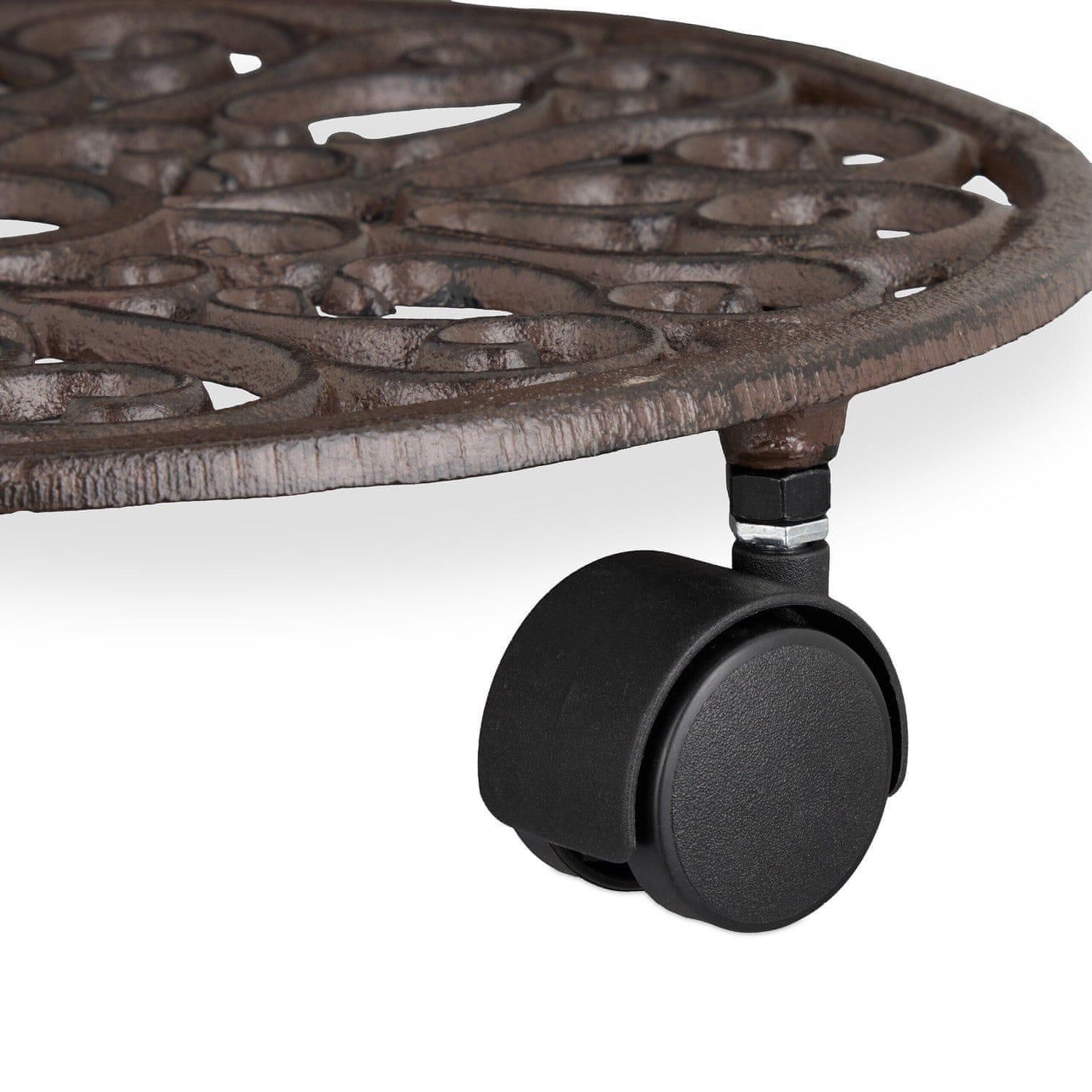 Za enostavno premikanje težkih loncev stojalo za rastline omogoča gladko mobilnost s štirimi kolesi litoželezna konstrukcija zagotavlja stabilnost in zaščito tal primerno za notranjo in zunanjo uporabo z dekorativnim videzom. Celoten opis