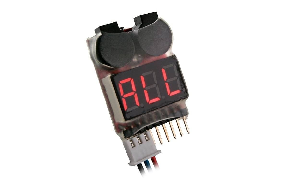 Digitalni merilnik napetosti za LiPo, LiFe, Li-ion baterije z 2–8 celicami z nastavljivim zvočnim prikazom nizke napetosti (2,70–3,80 V) za komplete 2–8S. Merjenje napetosti 4–15 V za baterije NiXX na vhodu (-) / 1S.