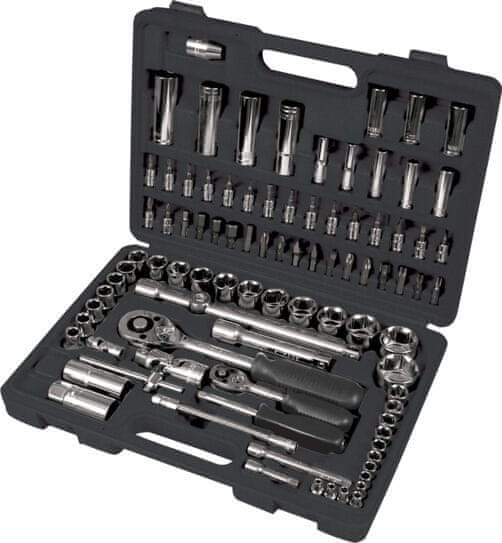 Komplet vsebuje tudi ročaj z grzechotko in univerzalni zglob, kar omogoča enostavno delo v težje dostopnih mestih. Vključene so tudi različne podaljške in adapterji, pri čemer so dolžine jasno opredeljene, kar omogoča prilagoditev različnim nalogam.