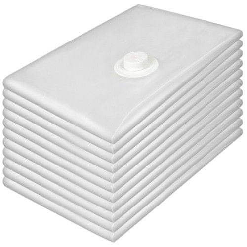 Komplet 10 vakuumskih vrečk je primeren za večkratno uporabo. Shranjeni predmeti so popolnoma zaščiteni pred prahom, umazanijo, vodo, vlago ali molji. Oblačila, shranjena brez zraka, so dlje časa videti kot nova. Za odsesavanje zraka preprosto uporabite običajen sesalnik ali črpalko za odsesavanje zraka, ki je priložena kompletu. Tako boste prihranili veliko prostora.