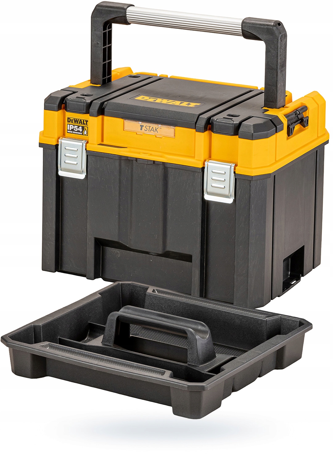 • Za majhno in veliko orodje – Kovček je razdeljen na glavni predal, v katerega se lahko spravi večja oprema (kot je brusilnik), odstranljiv pladenj širine 1/2 in organizator, skrit v pokrovu. Poleg tega je v notranjosti prostor za lokator orodja DEWALT, ki vam omogoča sledenje vaši škatli z orodjem z aplikacijo DeWALT Tool Connect. Celotna enota se zaklene z dodatno ključavnico (ni priložena).