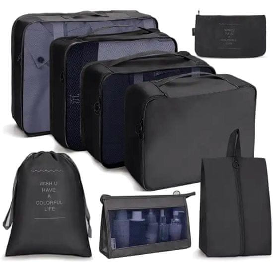 Priročen potovalni organizator, ki vsebuje do 8 elementov – 3 vrečke, 3 torbice, vrečko za ličila in vrečko. Vsi se zapirajo z zadrgo (razen vrečke) in imajo veliko predalčkov in žepov za shranjevanje! So odličen način za organizirano shranjevanje vsakodnevnih toaletnih potrebščin! Odlične so tudi za potovanja, saj vanje zlahka spravite vso nujno kozmetiko in druge majhne lepotne pripomočke, kot so šminka, puder, palčke in čopiči. Zahvaljujoč pametni zasnovi lahko vanje spravite tudi spodnje perilo in oblačila. Celota se zlahka prilega vaši ročni prtljagi in ne zavzame toliko dragocenega prostora. Zaradi zadrge je veliko težje izgubiti drobne predmete, ki jih nosite s seboj, hkrati pa vam omogoča, da imate vse pospravljeno. Vsi kosi v kompletu imajo priročen ročaj, zaradi česar so udobni za prenašanje. Naj bo vaša prtljaga urejena še danes!