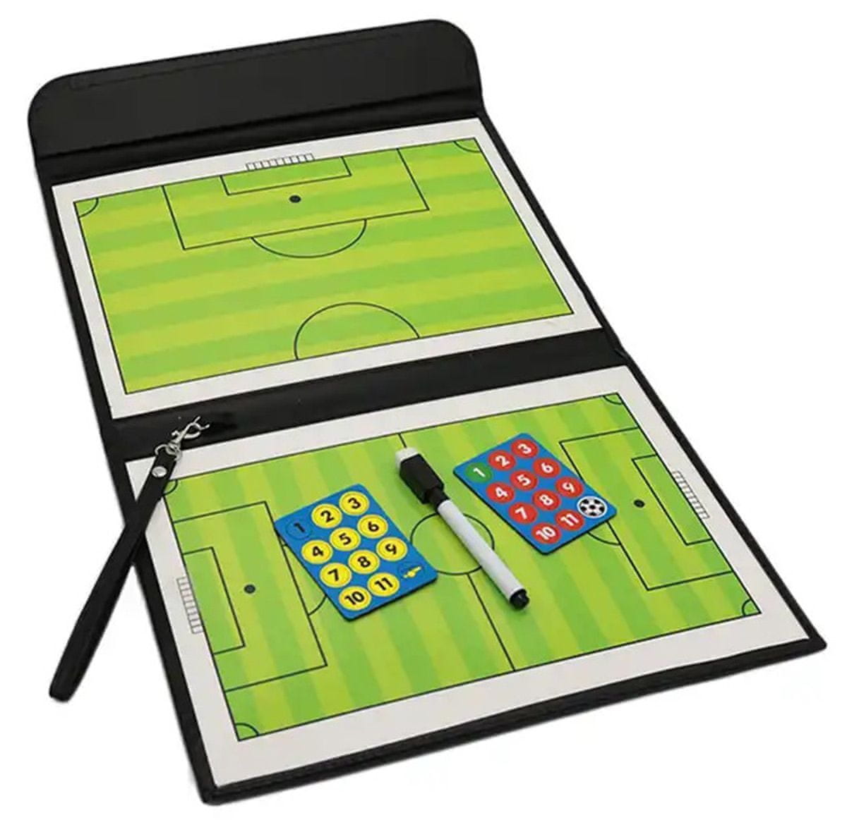 Taktična tabla za trening nogometa. Priročna oblika v obliki mape iz eko usnja, ki se zapenja z velcro. Opremljena je z dvema magnetnima tablama, ki ponazarjata igralno polje. Priloženi so tudi izbrisljiv marker in 24 magnetov. Tabla je izdelana iz vodoodpornega materiala, ki omogoča trening tudi v težkih vremenskih razmerah. Dodatni obešalnik omogoča, da se mapa obesi na kljuko.