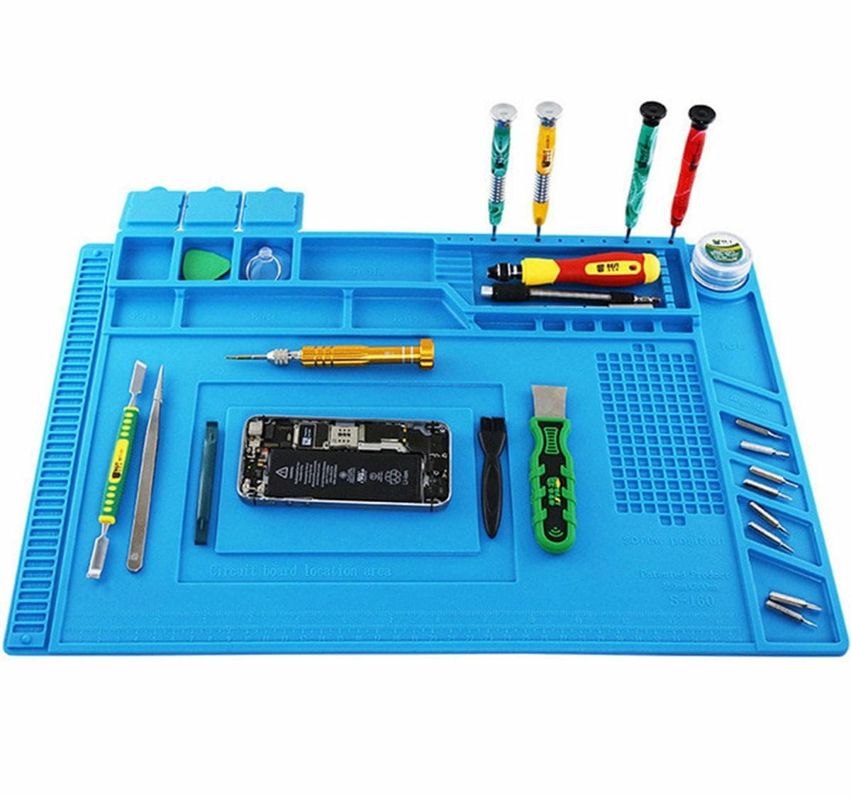 Večnamenska, antistatična silikonska podloga. Nujno potrebna za vsakega ljubiteljskega in profesionalnega mojstra. Zelo olajša vsa popravila elektronike in spajkanje. Odporna na visoke temperature (do 500 stopinj Celzija) in deformacije. Ima 4 magnetne točke: za magnetenje izvijačev, za dele in vijake ter številne predale in linearno skalo v centimetrih.
