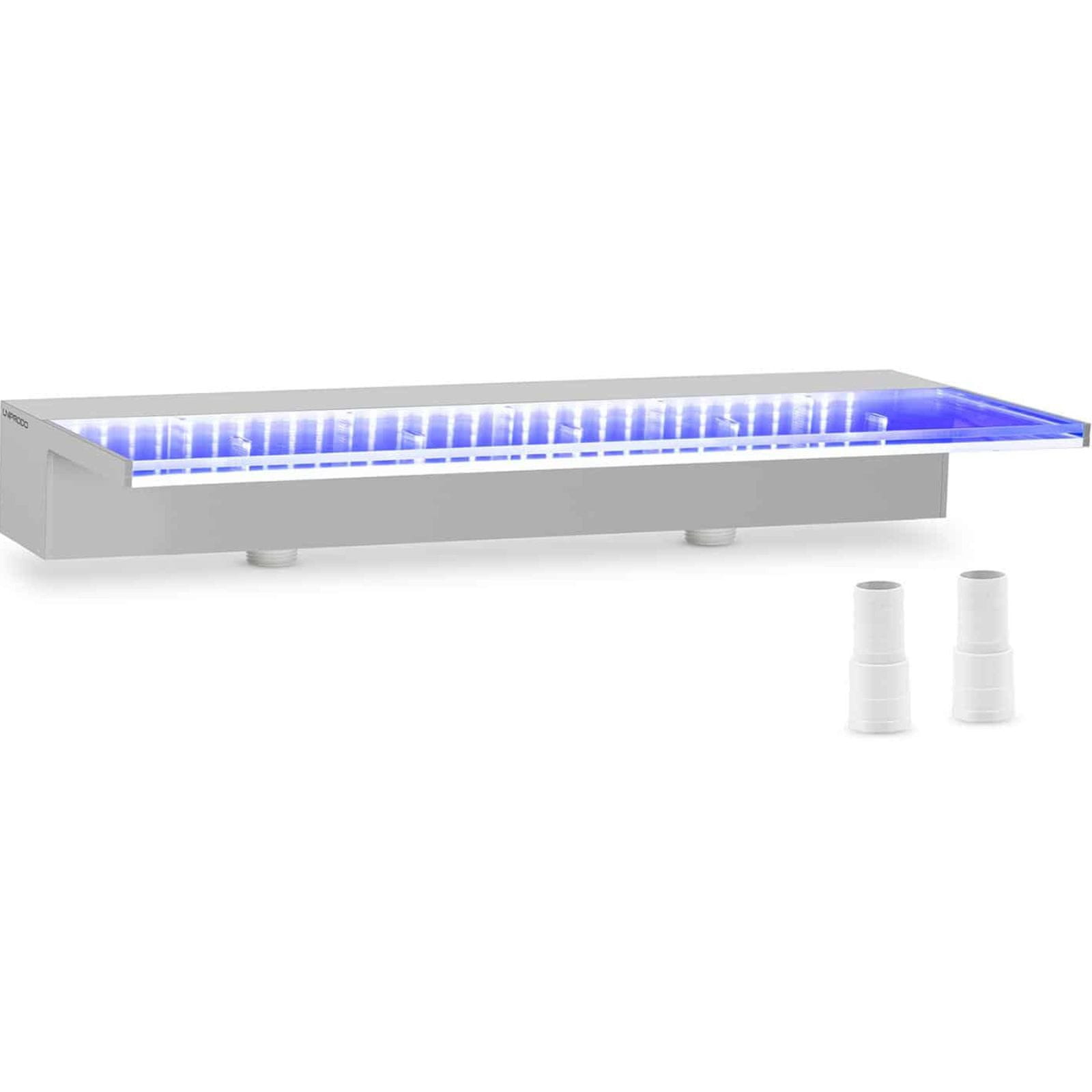 Vodni slap UNIPRODO je idealen kot sproščujoč okras na vrtu, terasi ali v bazenu. Voda iz 60 cm dolg ega iztoka zagotavlja enakomeren pretok vode, varčna LED-svetloba pa ustvarja vizualne poudarke, saj porabi le 24 W. Voda teče čez 135 mm širok rob kot slap. Svetilka je z vseh strani zaščitena pred škropljenjem vode, saj ima stopnjo zaščite IP44. LED diode v beli in modri barvi so vgrajene in estetsko dovršene, kar še poveča vizualni učinek. Izlivka je izdelana iz močnega akrila, ki ščiti pred poškodbami zaradi slane ali klorirane vode. Naprava zahteva minimalno vzdrževanje in ima dolgo življenjsko dobo.