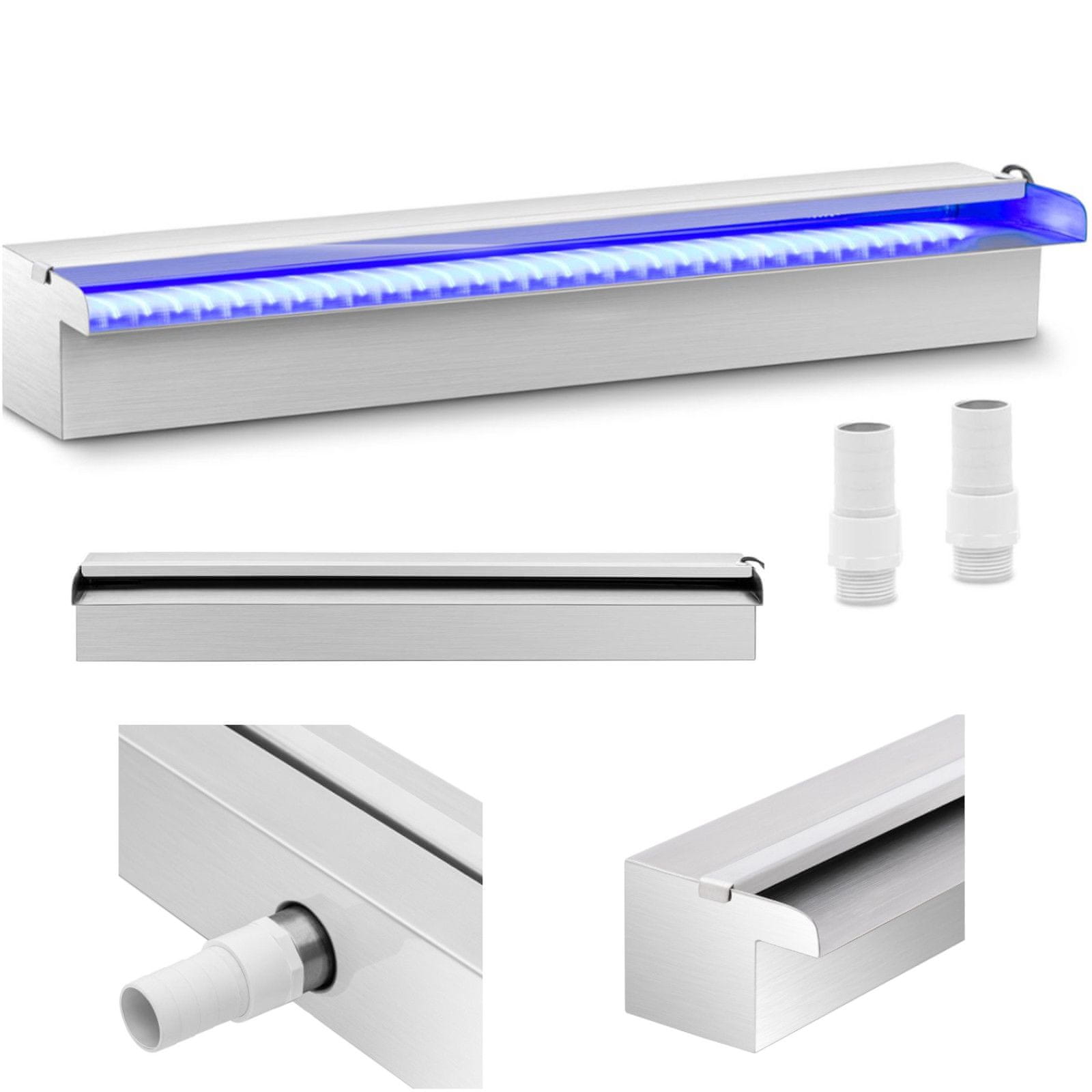 Vodni slap UNIPRODO je idealen kot sproščujoč okras na vrtu, terasi ali v bazenu. Voda iz 60 cm dolg ega iztoka zagotavlja enakomeren pretok vode, varčna luč LED pa ustvarja vizualne poudarke, saj porabi le 24 vatov. Zaradi zaščite IP44 je osvetlitev zaščitena pred brizganjem vode z vseh strani. Svetlobne diode LED v beli in modri barvi so integrirane in estetsko dovršene, kar še poveča vizualni učinek. Iztok je izdelan iz stabilnega in proti koroziji odpornega nerjavnega jekla, ki ščiti pred poškodbami zaradi slane ali klorirane vode. Naprava zahteva minimalno vzdrževanje in ima dolgo življenjsko dobo.
