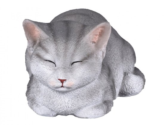 Vrtna dekoracija v obliki ležeče mačke. Izdelana je iz poliresina, ki figuri daje trdnost in odpornost na vremenske vplive. Dimenzije: dolžina 23 cm, višina 12 cm, globina 14 cm. Barva: siva, bela.