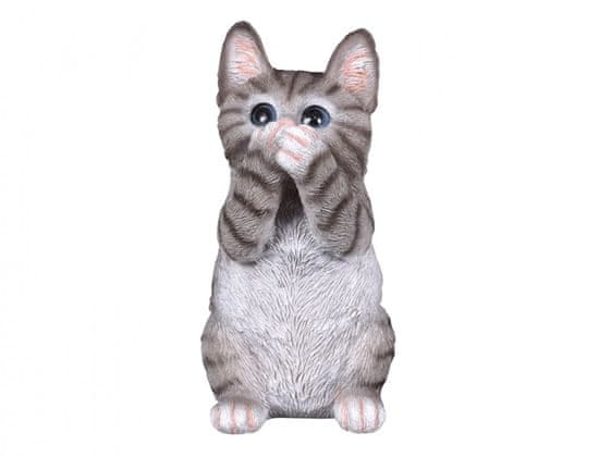 Razstavek za vrt v obliki mačke, ki si pokriva gobec v slogu „Ne govorim“. Izdelana je iz poliresina, ki figurici daje trdnost in tudi odpornost na vremenske vplive. Dimenzije: dolžina 16 cm, višina 18 cm, globina 11 cm. Barva: prašnata.