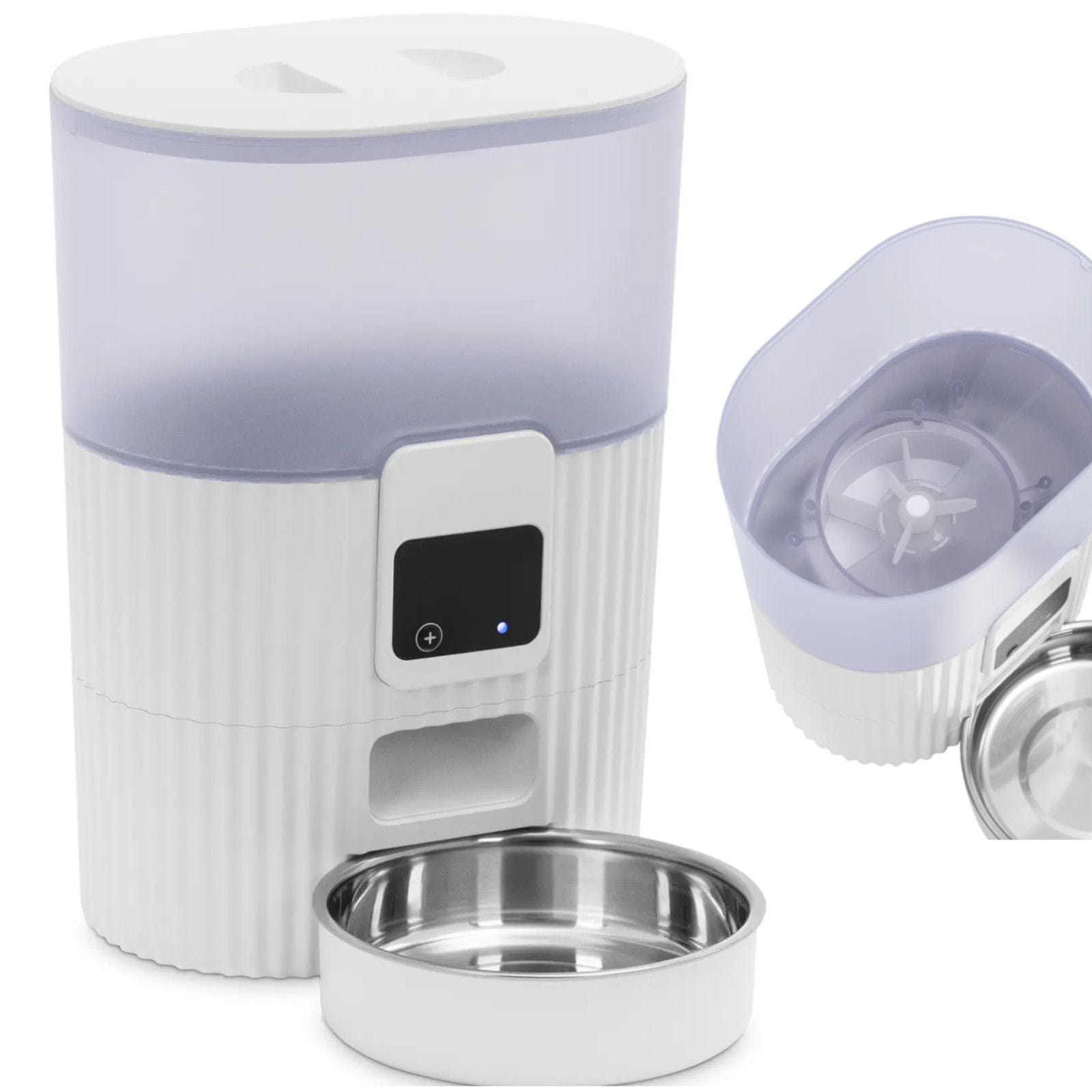 Avtomatski dozirnik hrane za mačke in pse Wiesenfield zagotavlja optimalno oskrbo za hišne ljubljenčke – tudi ko je skrbnik odsoten. Dozator ima veliko posodo za hrano ter individualno nastavljive cikle izhoda in količine hrane. Zaradi odstranljivih delov je čiščenje enostavno. Načelo delovanja dozirnika je zelo preprosto: preprosto napolnite prozorno posodo s hrano. Zaradi varnega zapiranja hrana ostane izven dosega vaših štirinožnih prijateljev. Oprema ob določenem času izda le želeno količino. Nastavite lahko do štiri obroke na dan in do šest obrokov na obrok. To lahko preprosto storite na nadzorni plošči s prikazovalnikom LED ali na mobilni napravi prek aplikacije. Zaradi velike prostornine 3,5 litra si lahko privoščite tudi daljše odsotnosti ali skrbite za več živali hkrati. Zaradi prozorne posode z dozirnikom lahko takoj vidite, kdaj je treba hrano ponovno napolniti. Avtomatski dozirnik hrane za hišne živali je zaščiten z dvojnim napajanjem: prek omrežnega priključka in baterijskega napajanja. Tako so živali oskrbovane s krmo tudi med izpadom električne energije ali po njem. Robustni hranilnik je izdelan iz posebej trdnih materialov, kot sta nerjavno jeklo in plastika ABS. Opremo je mogoče hitro in temeljito očistiti. Posamezne sestavne dele, posodo ali posodo za hranjenje, je mogoče odstraniti in ponovno namestiti, prav tako široko podnožje, ki zagotavlja stabilno namestitev.