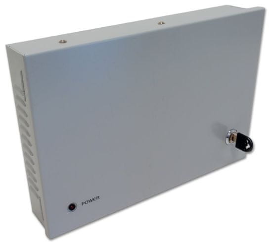 Stabiliziran napajalnik za šestnajst naprav, nastavljiva enosmerna napetost 11–14 V, vsak priključek največ 1,5 A. Skupni izhodni tok 12 A. Stenska omarica z nameščenim tiskanim vezjem, kabelska žrela. Kabelska povezava z notranjim priključnim blokom. Zaščita pred kratkim stikom s termistorji PTC, 1,5 A na priključek. LED indikacija funkcionalnosti vrat.