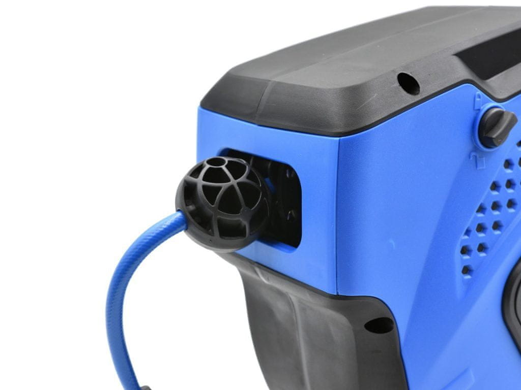 Pnevmatski kolut za cev iz visokokakovostnega ojačanega PVC-ja . Odlikuje ga visoka odpornost na visoke pritiske . Kolut je opremljen z blokado, ki preprečuje, da bi se cev sama odvila , in obešalom , ki omogoča, da cev obesite na steno.