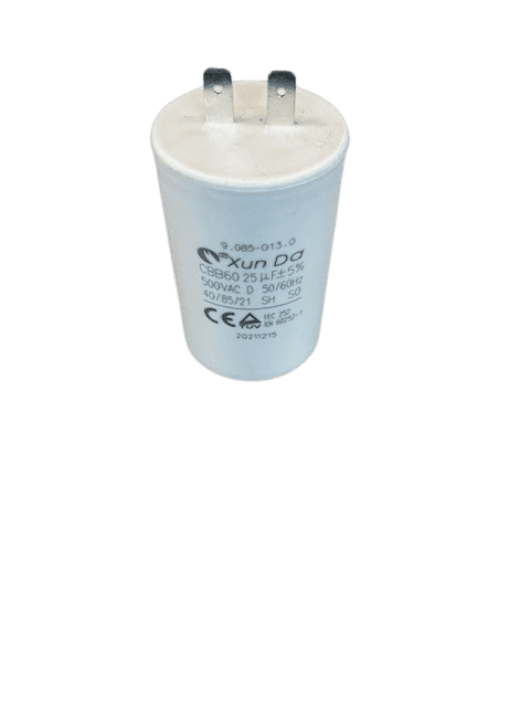 Kärcher Zagonski kondenzator 25 µF 9.085–013.0– Originalni del za tlačne čistilnike z enofaznimi motorji. Odgovoren za pravilen zagon in stabilno delovanje motorja. Zamenjava izrabljenega kondenzatorja povrne napravi polno moč in odpravi težave pri zagonu.