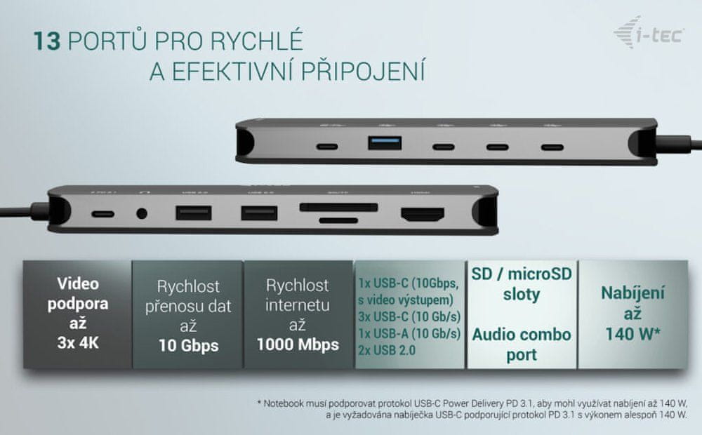 I-TEC USB-C Metal Nano 3× Display Dock je kompaktna dokovalna postaja v kovinskem dizajnu, ki bistveno razširi možnosti povezljivosti sodobnih združljivih naprav. Je lahko prenosna in idealna za uporabo v pisarni in na poti. Ima vrsto priključkov, ki jih boste cenili pri priključevanju monitorja ali perifernih naprav. Dodaja na primer tudi vrata RJ-45 za neposredno in stabilno omrežno povezavo ali vtičnico za kartico SD ali kartico micro SD. I-TEC USB-C Metal Nano Dock vključuje tudi pet vrat USB-C, pri čemer tri omogočajo prenos podatkov, drugo z Power Delivery za napajanje in zadnje z video funkcijo.