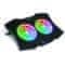 RGB hladilna podloga za prenosni računalnik 10 načinov RGB osvetlitve Nadzorna plošča z LCD zaslonom Nastavljiva hitrost ventilatorja in kot podloge LCD / SILENT / RGB / ANGLE / 2×USB / 15.6"/ SPEED controll Hladilna podloga z veliko kovinsko ploščo in dvema 115-milimetrskima ventilatorjema je zasnovana tako, da zagotavlja optimalen pretok zraka in dodatno zunanje hlajenje vašega prenosnika. Dva ventilatorja z visoko hitrostjo zagotavljata želeni pretok zraka z minimalnim hrupom. Hitrost ventilatorjev je nastavljiva s krmilnikom na sprednji plošči. Hladilna podloga ponuja 11 načinov osvetlitve RGB (vključno z načinom LED OFF), ki se krmilijo z lahko dostopnega in vidnega LCD-zaslona na sprednji plošči. Idealen kot gledanja zaslona in naravni položaj telesa zagotavlja osem nastavljivih višinskih položajev, ki zagotavljajo popoln kot prenosnika za igranje iger, pisarniško delo ali gledanje filmov. Dvojno priključno vozlišče USB na zadnji strani hladilne podloge preprečuje pomanjkanje priključkov USB na prenosniku. Štiri gumijaste nedrseče blazinice zagotavljajo največjo stabilnost na kateri koli ravni površini.