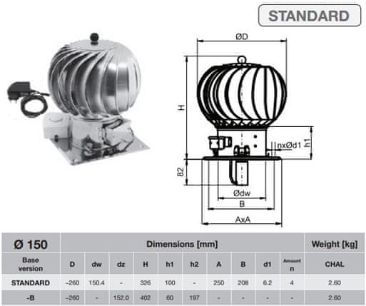 Rotacijski dimniški pokrov Hybrid Turbowent Tulipan je naprava, ki na dinamičen način izkorišča silo vetra za povečanje vleka dimnika, opremljena pa je tudi z nizkoenergijskim, brezkrtačnim elektromotorjem, ki ga stabilizira. Turbina se vedno vrti v isto smer, ne glede na moč ali smer vetra. Namenjen je namestitvi na zaključke prezračevalnih kanalov, ki delujejo pod vplivom gravitacije. Ko je hitrost vetra premajhna za doseganje želene učinkovitosti, elektromotor pospeši turbino, ko je premočan, pa jo upočasni. Ko je hitrost vetra dovolj močna, da doseže hitrost vrtenja, nastavljeno na krmilni napravi, motor ne deluje in pokrov deluje kot običajni Turbowent Tulipan. Priporočena uporaba: – Izdelek ni primeren za kurilne peči/peči – uporabljajte ga le za prezračevanje; – kadar so na koncu dimniškega kanala nihanja vetra zaradi slabe lokacije; – kadar je neugodna konfiguracija terena z močnimi in pogostimi vetrovi; – kadar ni vleka dimnika ali je ta prešibek; – za izboljšanje naravnega (gravitacijskega) prezračevanja. Značilnosti: – Napetost regulatorja hitrosti – 24 VDC; – Vrteča se enota – sistem krogličnih ležajev; – Največja poraba energije – 0,3 A; – Povprečna poraba energije – ~0,13 A; – Povprečna vhodna moč – 3 W; – Območje nastavitve – 0–500 vrt/min; – Priporočeno napajanje – 24 VDC, 1 A; – Temperatura okolice – od –30 °C do +70 °C. Izdelek je izdelan po naročilu – dobavni rok je približno 2 tedna. Primeren za dimnik s premerom 150 mm; Sistem krogličnih ležajev; Opremljen z brezkrtačnim elektromotorjem z nizko porabo energije; Elektromotor pospeši turbino navzgor ali navzdol; Izkorišča silo vetra za povečanje vleka dimnika; Izvedba z dodatno strešno ploščo; Priporočeno napajanje – 24 VDC, 1 A; Dobavljeno popolnoma sestavljeno in pripravljeno za montažo; Ima certifikat CE;