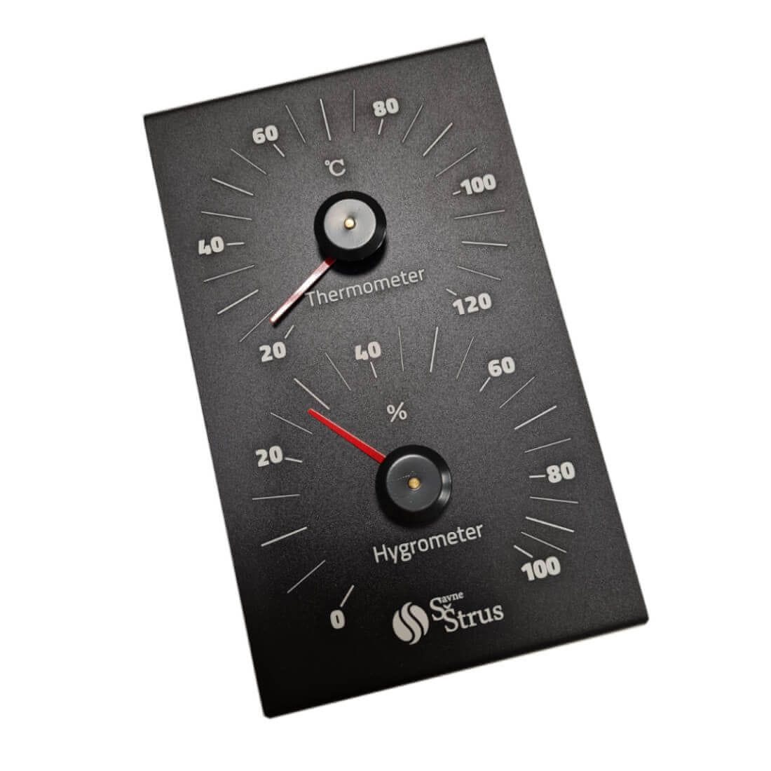 Eleganten termo higro meter v črni barvi je v vaši finski ali bio savni nepogrešljiv dodatek. Omogoča vam nazdor nad temperaturo in vlago v savni, hkrati pa s sodobnim dizajnom ustvari elegantno savno. termo in higro meter sta ločena, prikaz temperature in vlage odčitamo na različnih skalah.