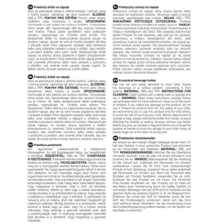 To priročno držalo za skodelico se zlahka pritrdi na voziček. Sponka se prilega večini oblik in premerov cevi na vozičkih in kolesih. Zaradi praktičnega držala vam ne bo več treba iskati otrokove stekleničke – vedno jo boste imeli pri roki. Idealen je tudi za skodelico za kavo, ki jo starši včasih zelo potrebujejo! Priročno držalo je preprosto nenadomestljivo pri sprehodih z otrokom. Drži pijačo v pravokotnem položaju in preprečuje njeno razlitje.