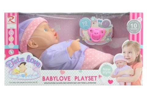 Dojenček z mehkim telesom. Otrok je oblečen v pisano pižamo, ki jo je mogoče sneti (velcro). Ko stisnemo trebušček, dojenček spušča zvoke. Dojenčka poganjajo 3 baterije AG13 (vključene). Dojenček meri približno 27 × 10 cm. Dimenzije paketa približno 30 × 16 × 12,5 cm. Starost 3+