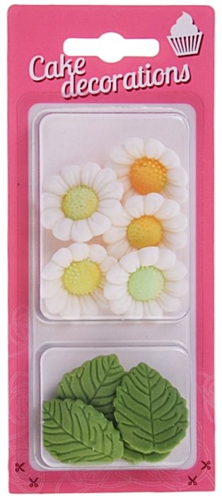 Novo v naši ponudbi! Sladkorne rože BELE KAMILICE + ZELENI LISTI 10 kosov so nežen in očarljiv dodatek, ki bo vašim pekovskim izdelkom dal edinstven čar. Odlične so za okrasitev tort, kolačkov ali mafinov, saj jim dajejo edinstven značaj.