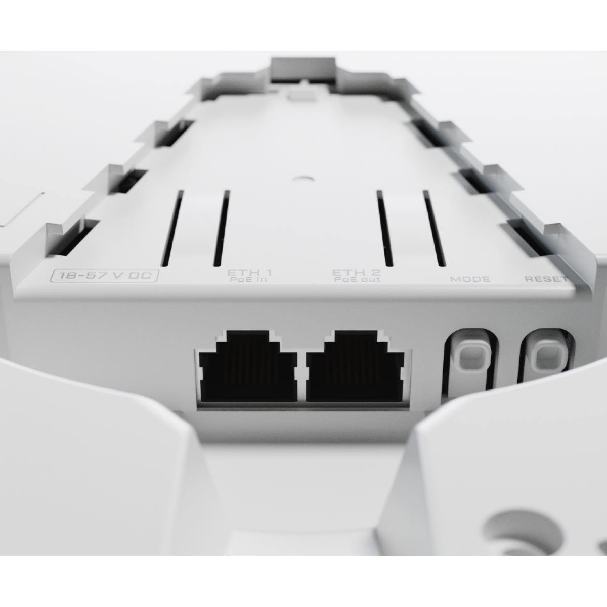 Čeprav radio podpira način repetitorja, vam dve vrati Gigabit Ethernet omogočata razširitev omrežja s kabli, tudi če je potrebno napajanje PoE: cAP XL ac podpira vhod 802.3af/at PoE na prvih vratih in pasivni izhod PoE (do 57V) na drugem priključku.