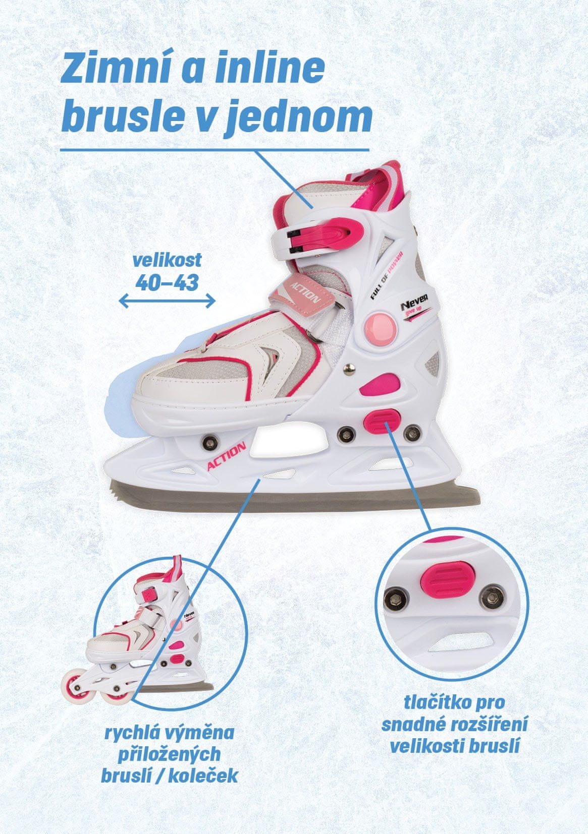 Ženske drsalke z zamenljivim podvozjem 2 v 1 so vsestranska linija drsalk za celoletno uporabo. Priloženi podvozji omogočata univerzalno zamenjavo rolerjev z zimskimi drsalkami – mehki čevelj z vezalkami, zaponko in trakom na velcro, notranje oblazinjenje s „spominom“, ležaji ABEC-5, ojačano plastično podvozje, plastificirana PU kolesa 72 × 24 mm v prozorni barvi, velikost 40–43. Rezilo za zimsko drsanje ima osnovo iz plastike ABS in kovinsko rezilo iz kaljenega jekla. Visokokakovostno podvozje, ležaji in kolesa ter zimski nož omogočajo udobno drsanje skozi vse leto. Nosilnost drsalk je 80 kg. Zamenjava je zelo preprosta, tako da popustite in odstranite rezilo iz držala ter po vstavitvi drugega držala zategnete te vijake.