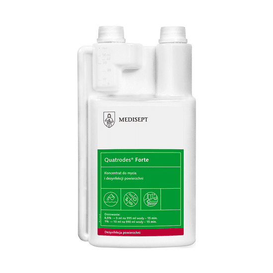 Quatrodes Forte 1l je tekoči koncentrat za sočasno čiščenje in dezinfekcijo površin v medicinskem področju (enote, postelje in stoli za zdravljenje, operacijske mize, medicinska oprema, tla, stene), v gostinstvu, domovih za ostarele, sanatorijih, telovadnicah, fitnes in spa salonih, frizerskih in kozmetičnih salonih, solarijih (za dezinfekcijo solarijev), masažnih in tetovirnih salonih, vrtcih, šolah ter za dezinfekcijo površin, ki so v stiku z živili.