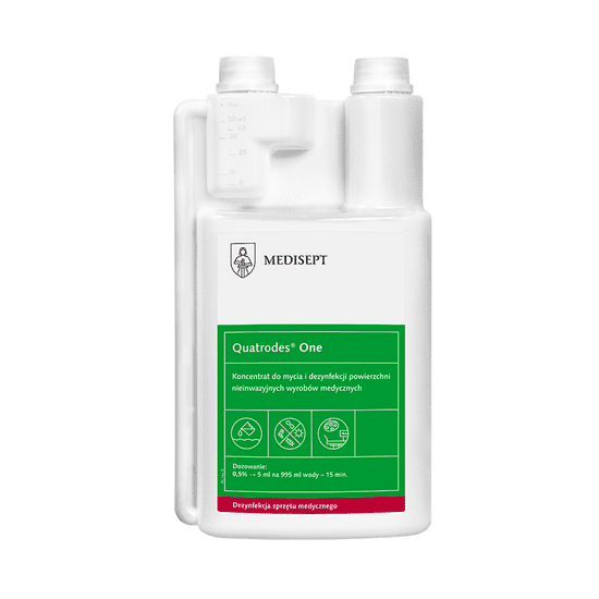 Quatrodes One 1L je koncentrat za čiščenje in razkuževanje površin neinvazivnih medicinskih pripomočkov. Učinkovit koncentrat za sočasno čiščenje in razkuževanje neinvazivnih medicinskih pripomočkov, kot so terapevtske enote, terapevtske postelje in stoli, operacijske mize in medicinska oprema.
