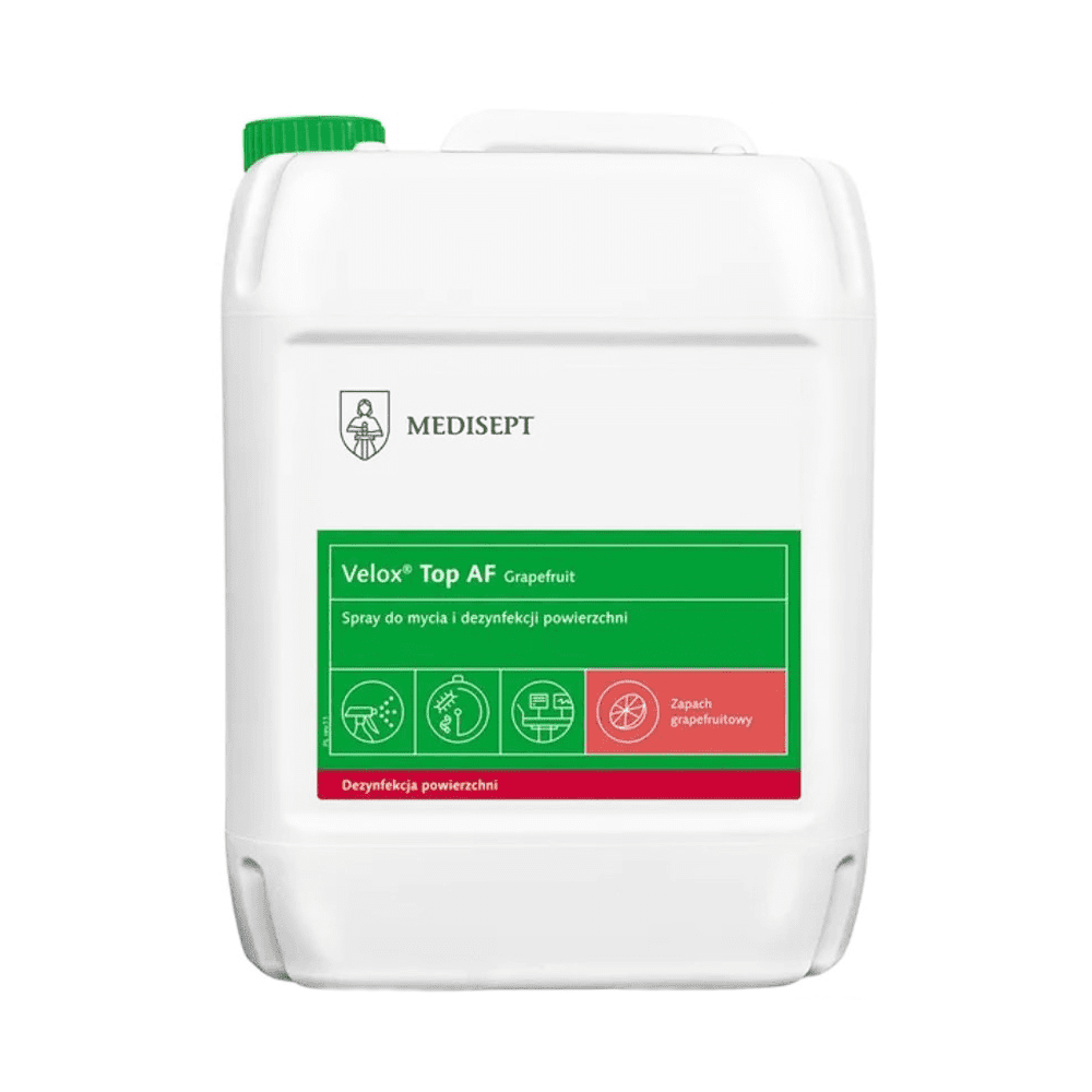 Velox Top AF grenivka 5l je tekočina na osnovi alkohola za čiščenje in hitro razkuževanje majhnih površin (stolov za zdravljenje, operacijskih miz, medicinske opreme in zobozdravstvenih nastavkov pred sterilizacijo).