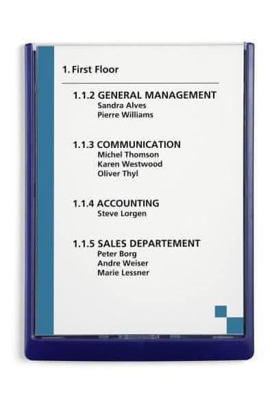 Dimenzije: 210 × 297 mm. Modre barve. Inovativne informacijske tablice z atraktivno zaokroženo oblikovanimi robovi. Prava kombinacija modernega dizajna in funkcionalnosti. Vložne lističe je enostavno zamenjati, le dvignemo in spustimo pozorno sprednjo ploščo. Idealne za uporabo na mestih, kjer. Celoten opis