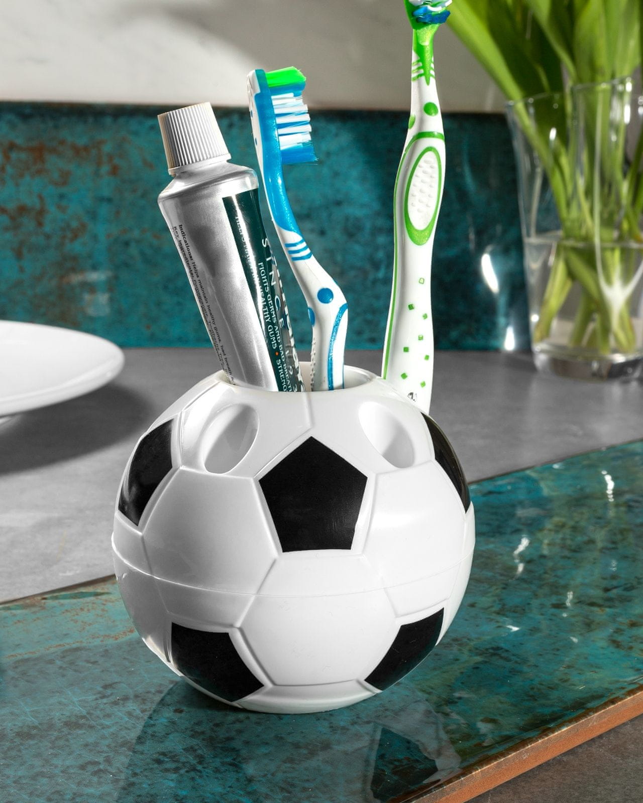 Lepo držalo/stojalo za peresa in toaletne pripomočke za nogomet za vse ljubitelje nogometa. Kul oprema za vašo mizo ali polico v kopalnici, da bo vedno urejena.