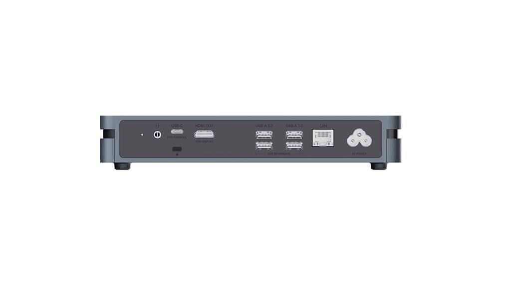 • I/O Vrata (Mini PC): 4× USB-A 3.0, 1× RJ45 (LAN), 1× USB-C (za povezavo z zaslonom na dotik), 1× HDMI OUT, 1× Audio OUT, 1× AC POWER, 1× Kensington Lock Slot