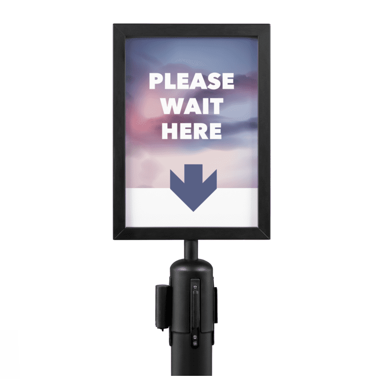 Securit RSSIGNA4BL – PREGRADNI informacijski okvir za A4 format papirja nizozemske blagovne znamke Securit® je namenjen pritrditvi na STEBRIČEK z IZVLEČNIM TRAKOM za usmerjanje ali ustavljanje ljudi pri prihodu v prostor. Črno lakirano nerjaveče jeklo je odporno na vse vremenske vplive, prav tako tudi zaščitna protizrcalna folija.