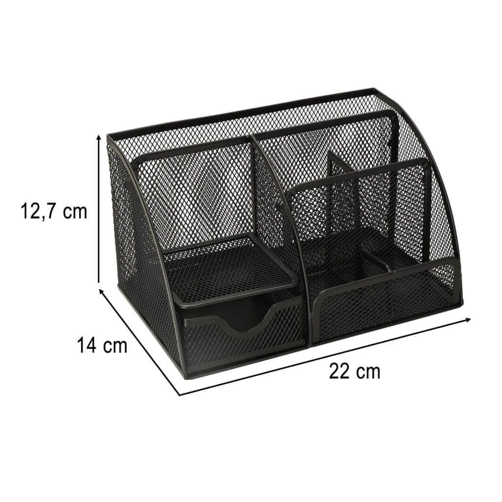 NAMIZNI ORGANIZATOR KOVINSKI NAMIZNI ORGANIZATOR S 7 PREDALI Črn namizni organizator: olajša organizacijo – sedem predelkov omogoča učinkovito razvrščanje in organiziranje pisarniških pripomočkov Minimalističen dizajn – zaradi črne kovinske mreže je organizator primeren tako za študentsko sobo kot za pisarno. ne samo za pisarno – uporablja se lahko za shranjevanje čopičev za ličenje, šmink ali drugih manjših predmetov. Tehnične specifikacije: Material: kovina Barva: črna Število predelkov: 7 Dimenzije organizatorja: Dimenzije: 22 cm x 14 cm x 12,7 cm Dimenzije predala: 8,7 cm x 9,2 cm x 4 cm Dimenzije embalaže: 22,6 cm x 14,5 cm x 13 cm Say adijo od nereda na vaši mizi! S pomočjo praktičnega organizatorja lahko organizirate svoje pripomočke in vaša miza bo končno pospravljena. Zahvaljujoč sedmim predelkom različnih velikosti lahko preprosto organizirate pisala, svinčnike, škarje, sponke in druge drobnarije. Izvlečni predal je idealen za samolepilne listke. Minimalistična oblika organizatorja se popolnoma prilega vsaki notranjosti. In zahvaljujoč mrežasti konstrukciji lahko preprosto vidite vse svoje dodatke. Organizator je idealen tudi za organiziranje drugih predmetov: kozmetike, drobnega orodja ali česar koli drugega, kar je treba organizirati. Pakirano v kartonski škatli.