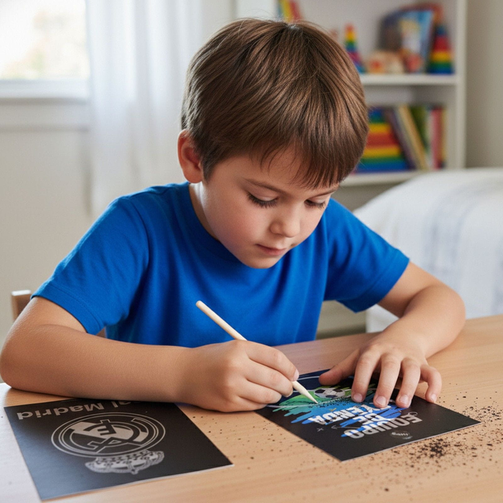 Komplet vsebuje dva lista za praskanje s skritimi grafikami in leseno paličico, s katero lahko raziskujete motive Real Madrida.