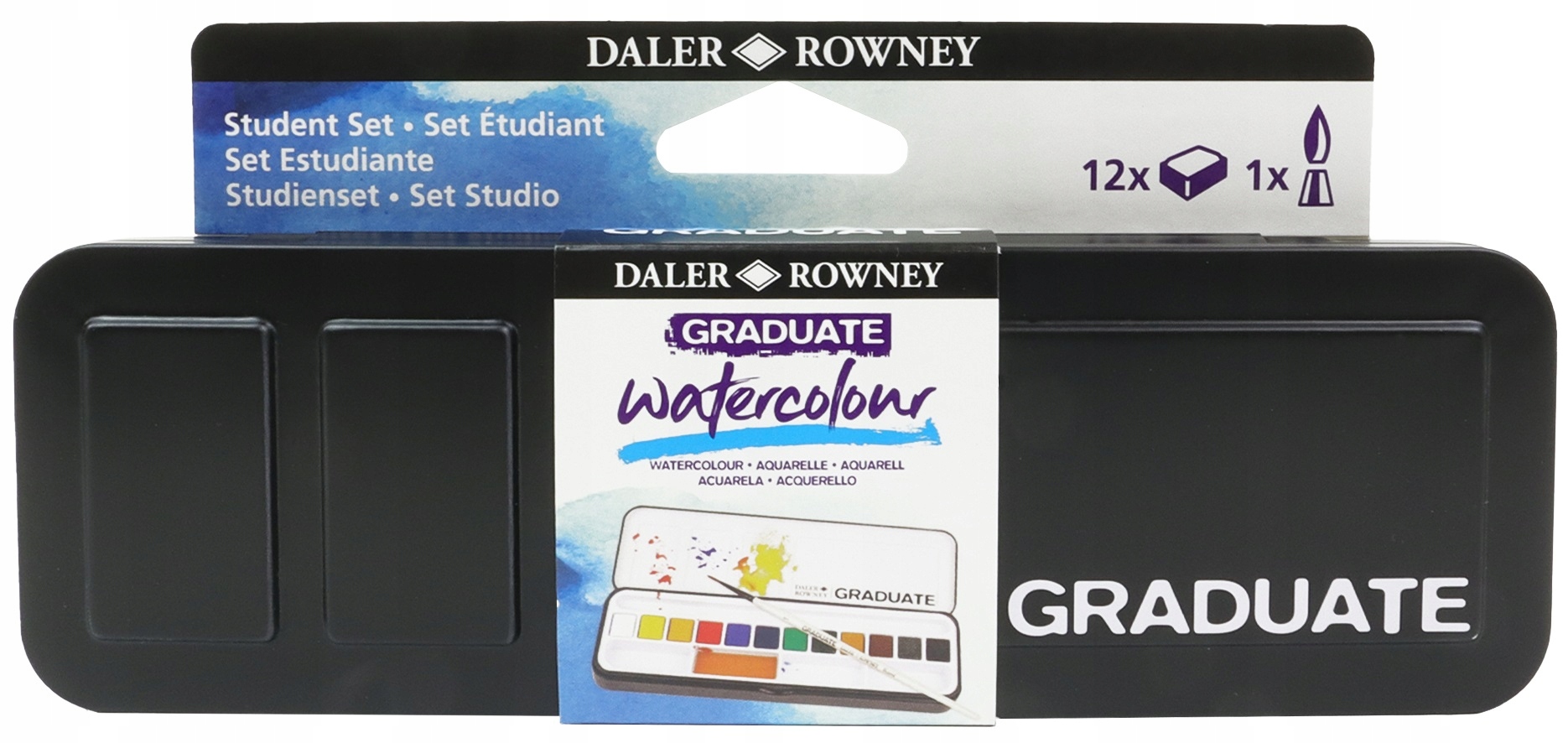 Komplet barv serije Daler-Rowney Graduate je sestavljen iz 12 akvarelnih barv v pol ponvicah in okroglega čopiča v priročnem etuiju. Barve z dobro pigmentacijo, barvno čistostjo in nežno prekrivnostjo.
