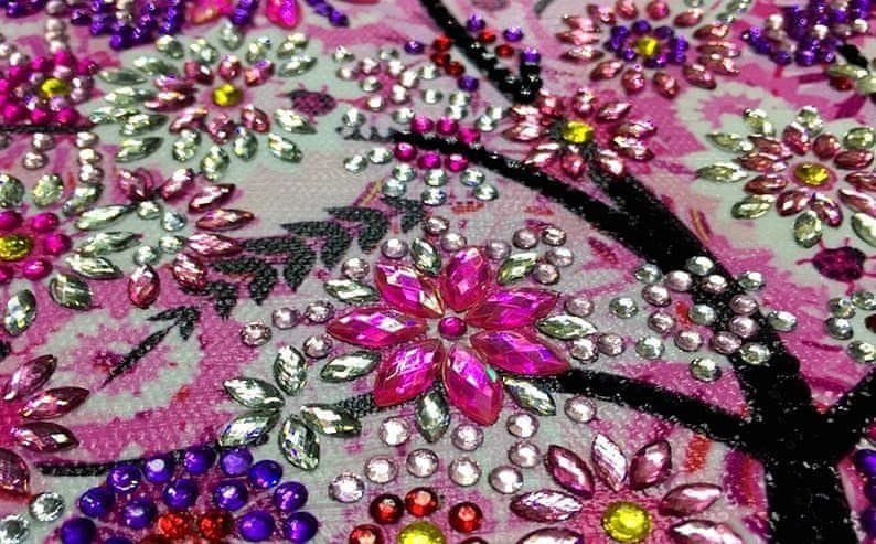 1. Platno z detajlnim potiskanim vzorcem in lepilno plastjo, na katero so prilepljeni diamanti.