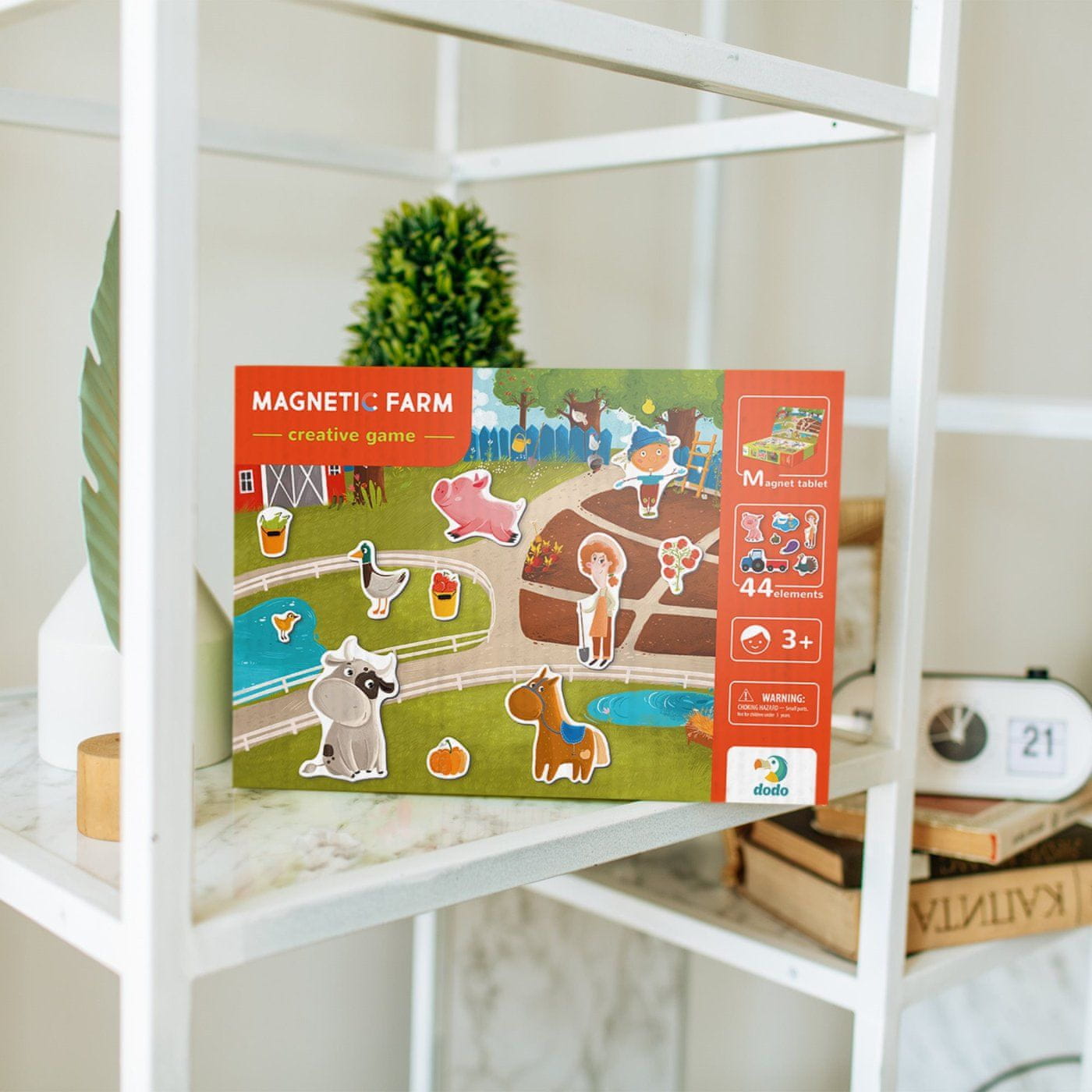 Set vsebuje magnetno tablo in 44 magnetnih elementov s kmečkimi živalmi. Otroci lahko ustvarijo svoje zgodbe z živalmi v glavni vlogi ter razvijajo svojo domišljijo in ustvarjalnost. Magnetna tabla je zlahka prenosljiva, kar omogoča igro doma in na poti. Igra spodbuja fino motoriko in razvoj jezikovnih spretnosti. Škatla služi kot stojalo za magnetno igralno ploščo.