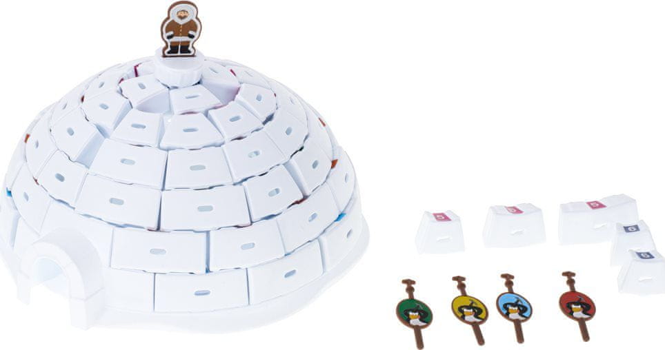 Eskimo je končno dokončal svoj iglu in se postavil na njegov vrh, toda kaj se dogaja? To so spet pingvini! Poskušajo uničiti iglu. Igra odlično razvija ročno spretnost in okretnost – ne smete dovoliti, da iglu razpade in Eskimo pade: 64 ledenih kock, 4 pingvini, 1 eskimovec, 1 kupola, 1 podstavek in komplet nalepk velikost igluja: 21 × 24 cm velikost pingvina: 4,5 × 2 cm