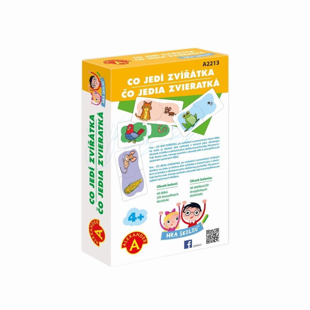 Gra Višja šola – Kaj jedo živali, namenjena otrokom, starim že 4 leta, je polna živali in njihovih dobrot. S pomočjo dvodelnih velikih kart se otroci učijo, kaj živali jedo. Oblika povezav jim pove, ali so res našli pravo druga.temaskoraj vsak otrok ima rad živali in ga zanima tudi njihovo življenje. Izobraževalna igra, THE SCHOOL GAME – WHAT ANIMALS EAT je škatla polna živali, ki jo bodo otroci uporabili za raziskovanje sveta okoli samega sebe.Girls, fantje, bodo iskali in povezali dva dela, ki spadata skupaj, da bi tvorila eno ploščico. Razložili in pomešali bodo vse koščke. Nato bodo poiskali, s čim se žival prehranjuje. Opazuj, išči in kombiniraj. S to igro se bodo otroci naučili prepoznati 20 najbolj znanih živali in 20 vrst živalskih dobrot. Izboljšajo svoje sposobnosti opazovanja in logičnega sklepanja, poleg tega pa razširijo svoj besedni zakladsam.če otroci niso prepričani, da gresta žival in njen najljubši priboljšek skupaj, bodo to vedeli takoj, ko bodo sestavili obe polovici krožnika, po obliki valovnice, ki se let.Vsebina paket: 40 dvodelnih krožnikov z živalmi iz trdnega kartona, češka in slovaška navodila za igro