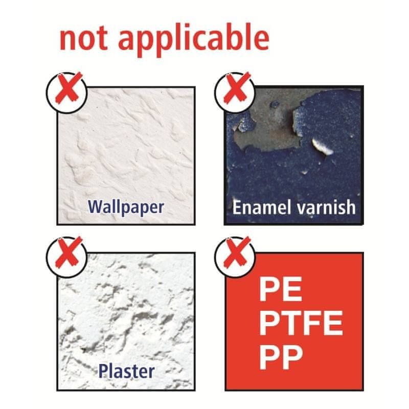 • ne deluje na tapetah, ometu in drugih nelepljivih površinah