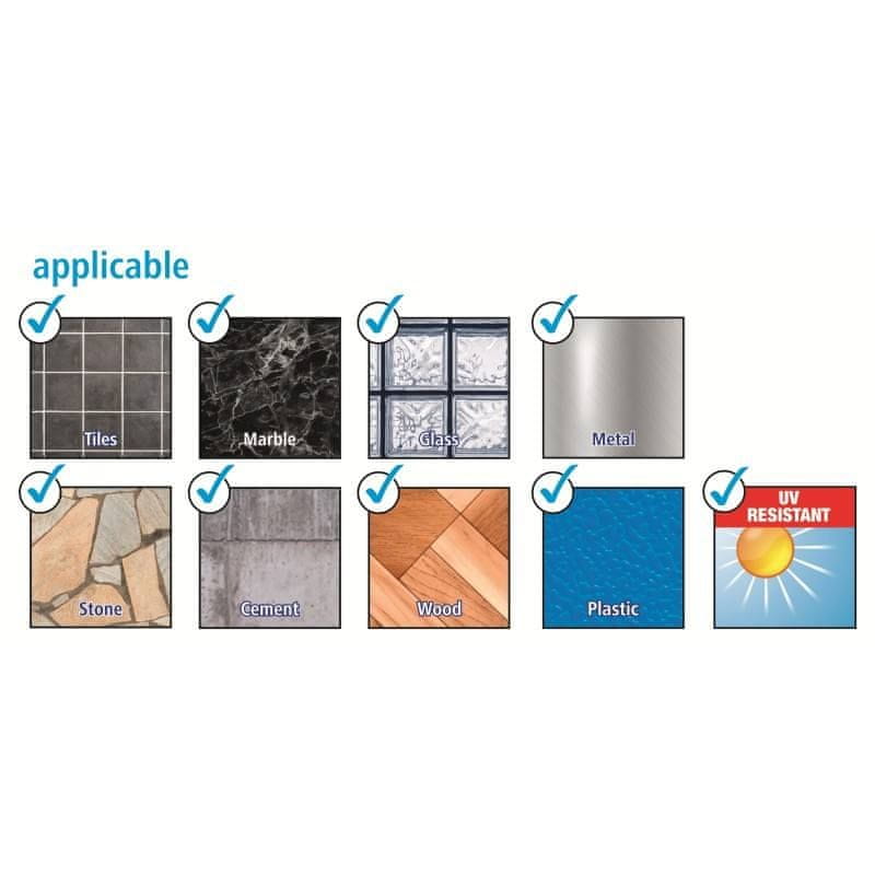 • na ploščice, kovino, naravni kamen, marmor, beton, les, steklo in številne vrste plastike