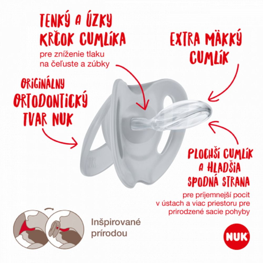 Dojčnik NUK Star je zares mehak v otrokovih ustih. Zaradi posebej mehkega območja na vrhu dude (namesto stanjšane silikonske plasti) je pritiskanje na nebo še bolj udobno. Primeren je za pravilen razvoj čeljusti in še posebej nežen pri dojenju – zlahka ga lahko izmenično uporabljate za dojenje in uspavanje z dudo.